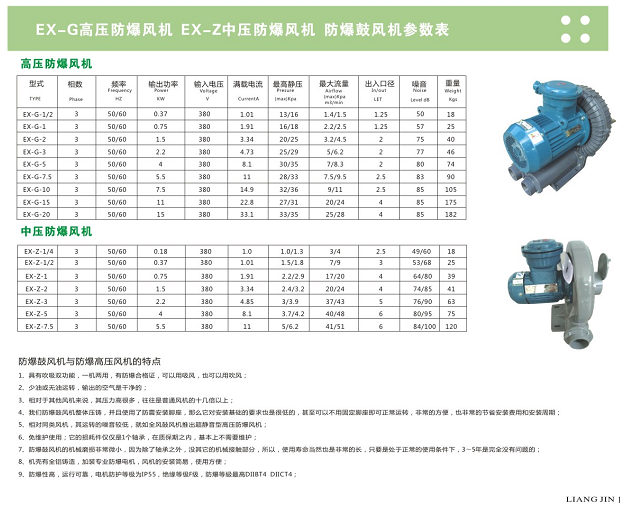 防爆風(fēng)機(jī)性能介紹:1、防爆性能高,運(yùn)行可靠:電機(jī)保護(hù)桿為IP55,軸通位置采用V型軸密封圈,接線盒采用環(huán)縫加密密封圈,提高主要部件的加工精度,底座采用平行垂直散熱器結(jié)構(gòu),增加散熱面積等機(jī)電設(shè)計(jì)措施,防塵防水比Yb系列IP54高出一極,電機(jī)運(yùn)行更可靠。2、二是防爆性能高,運(yùn)行非??煽俊k姍C(jī)防護(hù)等級為IP55。軸通位采用V型軸密封圈,接線盒采用環(huán)縫加密密封圈,提高了主要零件的加工精度。機(jī)座還采用平行垂直翅片結(jié)構(gòu),增加散熱面積等機(jī)電設(shè)計(jì)措施。防塵防水等級比Yb系列IP54高一級,使電機(jī)運(yùn)行更加可靠。 渦旋送風(fēng)引風(fēng)防爆風(fēng)機(jī)的工作特性:1、具有吹吸雙重功能。一臺機(jī)器可用于抽吸和吹氣;2、少油或無油運(yùn)行時(shí),輸出空氣清潔;  ;